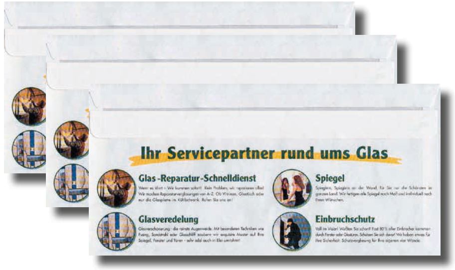 Nutzen Sie diese kostenlose Werbefläche zur Präsentation Ihres großen Leistungsangebotes. Format DIN Lang mit Fenster: 100x220 mm. Rückseite farbig bedruckt.