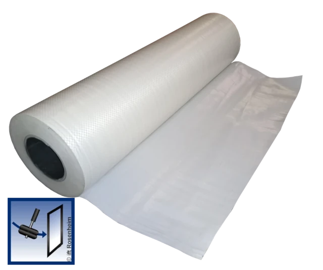 Geschlossener Kunststoff ohne Struktur. Anwendung auf der Spiegelrückseite oder als Notverglasungsfolie.