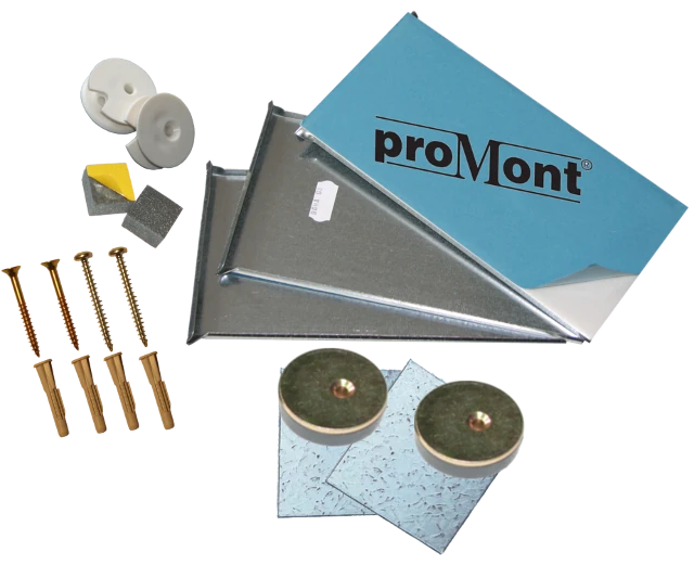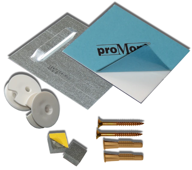 Spiegelbefestigung unsichtbar zur Spiegelmontage von Spiegeln bis 0,8 m² Größe. Das Spiegelmontageset enthält zwei selbstklebend proMont® beschichtete Bleche,