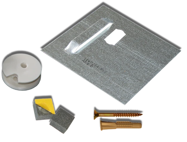 Spiegelbefestigung unsichtbar zur Spiegelmontage für Spiegel bis 1 m². Das Spiegelmontageset enthält 2 verzinkte Magnethaftbleche mit Kieme, selbstklebend