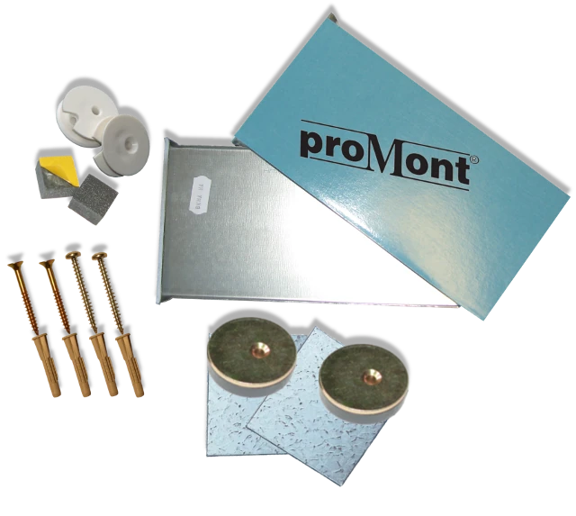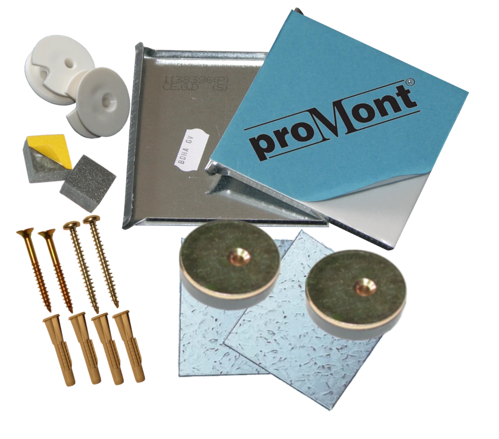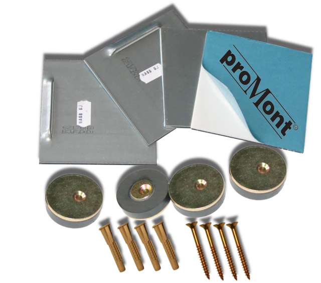 proMont® beschichtet (200 x 100 x 0,80 mm), 2 verzinkte Magnethaftbleche glatt, selbstklebend proMont® beschichtet (70 x 70 x 2 mm), 3 Exzenterscheiben,