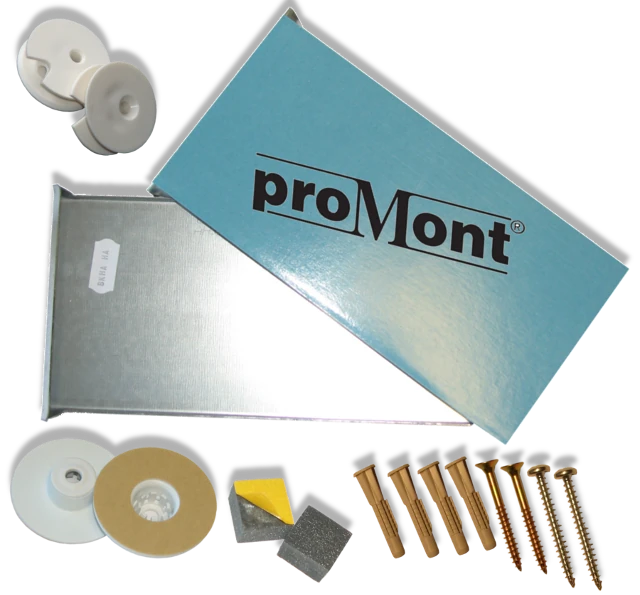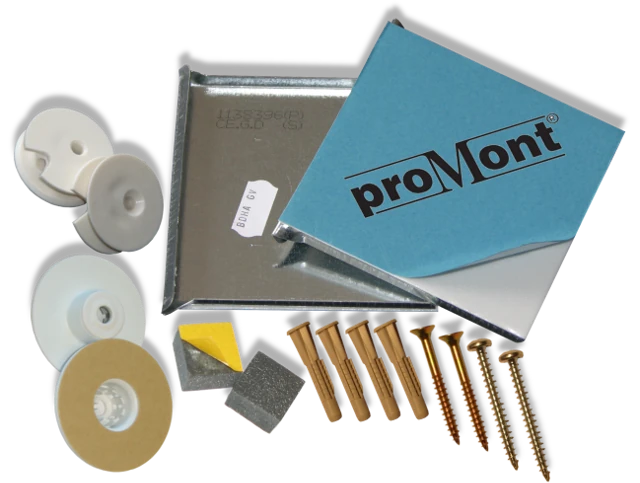 proMont® beschichtet (200 x 100 x 0,80 mm), 2 Exzenterscheiben, 2 Druckknöpfe, 2 Abstandhalter, 4 Schrauben (4,5 x 50 mm), 4 Dübel (Ø 6 mm). VE ab 2 St/TE=24 St.