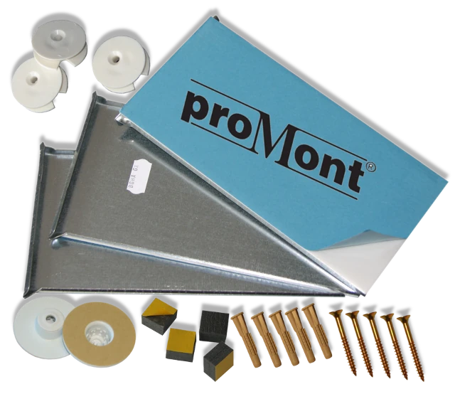 Das Spiegelmontageset enthält 2 verzinkte Bleche, gekröpft, selbstklebend proMont® beschichtet (200 x 100 x 0,80 mm),